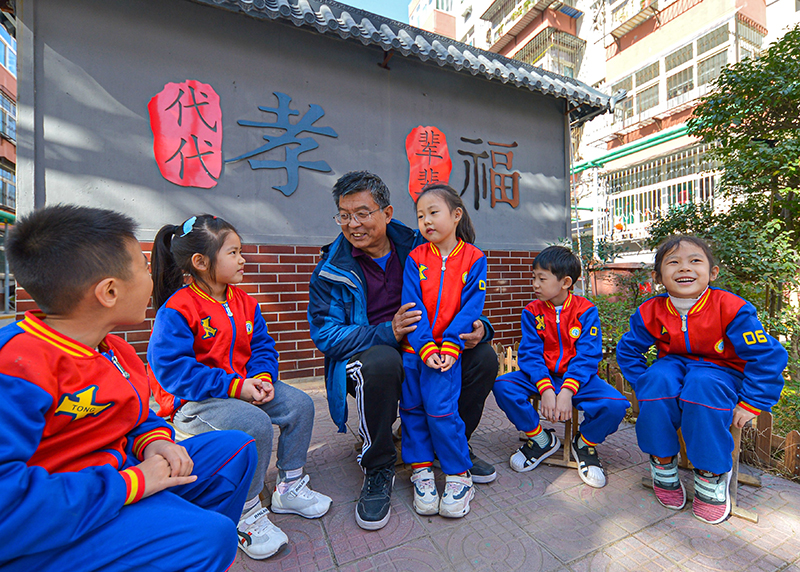 2020年11月2日,在河北邯鄲市邯山區(qū)中華南四號小區(qū),宣講員在向孩子們講家風(fēng)家訓(xùn)故事。新華社記者 王曉 攝