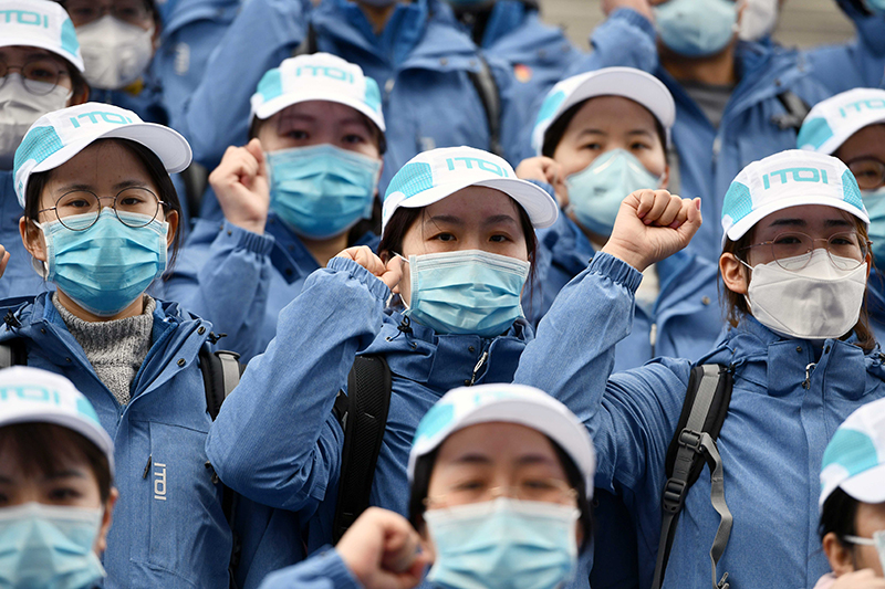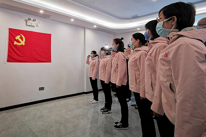 2020年2月9日,在山東濟(jì)南,山東大學(xué)第二醫(yī)院支援湖北抗疫國家醫(yī)療隊中的黨員在出發(fā)前重溫入黨誓詞。新華社記者 朱崢 攝