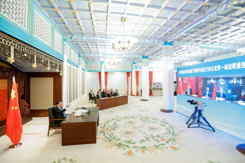 國務(wù)院總理李克強(qiáng)1月27日上午在中南海紫光閣以視頻連線方式聽取澳門特別行政區(qū)行政長官賀一誠2020年度的述職報(bào)告。賀一誠匯報(bào)了澳門特別行政區(qū)政府過去一年工作和當(dāng)前形勢。