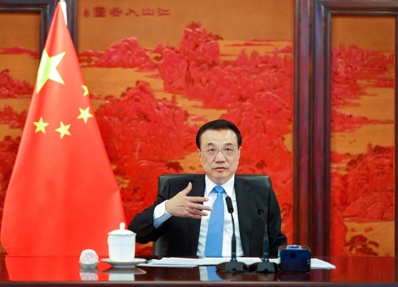 國務(wù)院總理李克強4月13日在中南海紫光閣出席同美國工商界領(lǐng)袖視頻對話會。美中貿(mào)易全國委員會和20余家美國知名跨國公司董事長和首席執(zhí)行官參加。李克強同他們互動交流,并回答提問。美國前財政部長、鮑爾森基金會主席亨利?鮑爾森主持。