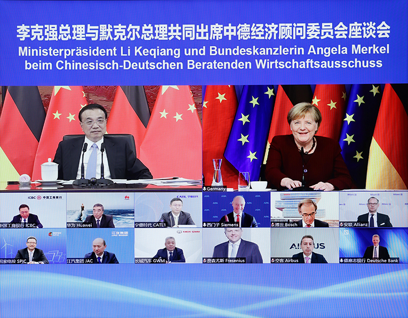 10月18日,國(guó)務(wù)院總理李克強(qiáng)在北京中南海紫光閣與德國(guó)總理默克爾以視頻方式共同出席中德經(jīng)濟(jì)顧問(wèn)委員會(huì)座談會(huì),并同與會(huì)代表交流。新華社記者 劉彬 攝