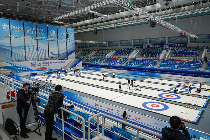 2021年4月6日,運動員在冰壺項目測試活動中。2022年北京冬奧會將國家游泳中心“水立方”改造為“冰立方”,用作冰壺項目比賽場館,有效減少建設投資,更讓夏奧場館煥然新生,拓展多元賽后經(jīng)營能力。新華社記者 彭子洋 攝