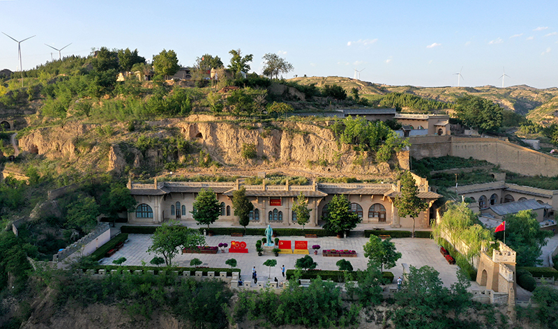 游人在陜西省榆林市米脂縣楊家溝革命舊址參觀(2021年9月10日攝,無人機照片)。新華社記者 陶明 攝