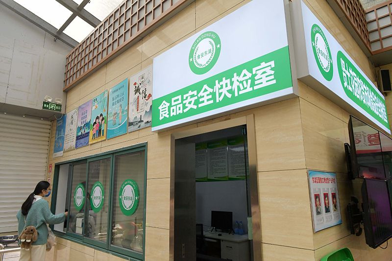 2021年12月7日,在江西省南昌市東湖區(qū)賢士花園農(nóng)貿(mào)市場,市民將剛購買的蔬菜送檢。2021年,東湖區(qū)在全區(qū)11個農(nóng)貿(mào)市場建成食品安全快速檢測室,對市民送檢樣品中的農(nóng)藥殘留、瘦肉精、甲醛等11種有害物質(zhì)進行免費現(xiàn)場快速檢測,守護群眾“舌尖上的安全”。新華社記者 彭昭之 攝