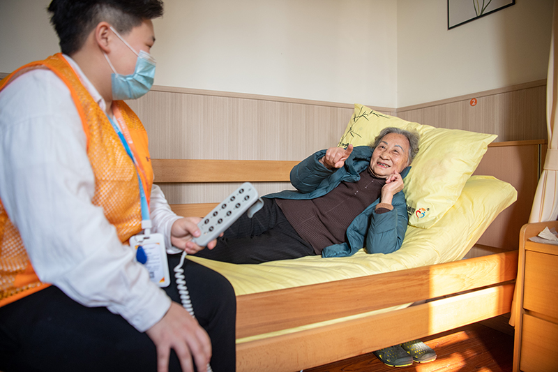 2021年12月2日,在重慶市渝北區(qū)仙桃街道養(yǎng)老服務中心,陳佩蘭老人(右)在護理員陳傲的幫助下體驗使用“智能護理床”。新華社記者 唐奕 攝