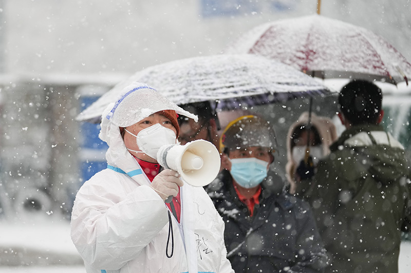 3月18日,在北京市東城區(qū)北新橋街道一處核酸采樣點,工作人員冒雪引導前來檢測的居民。新華社記者 鞠煥宗 攝