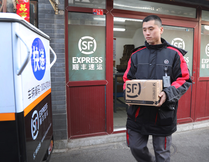順豐北京石頭胡同營業(yè)站“快遞小哥”劉闊在整理包裹(2019年2月1日攝)。新華社記者 李德欣 攝