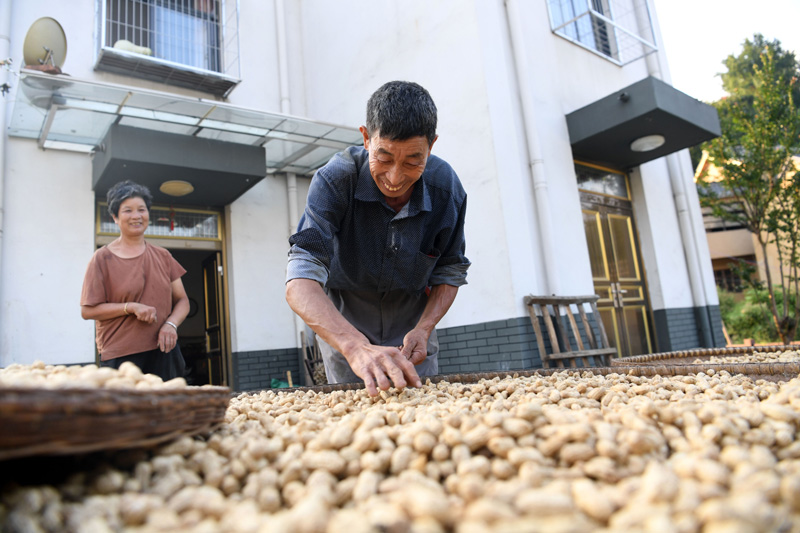 安徽省金寨縣大灣村村民在自家新房前晾曬花生(2019年9月3日攝)。新華社記者 鮑菲菲 攝