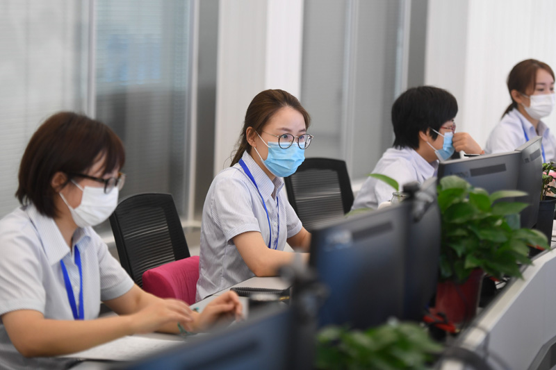 工作人員在浙江省諸暨市社會矛盾糾紛調處化解中心綜合信息指揮室處理群眾反映的問題(2020年7月16日攝)。新華社記者 黃宗治 攝