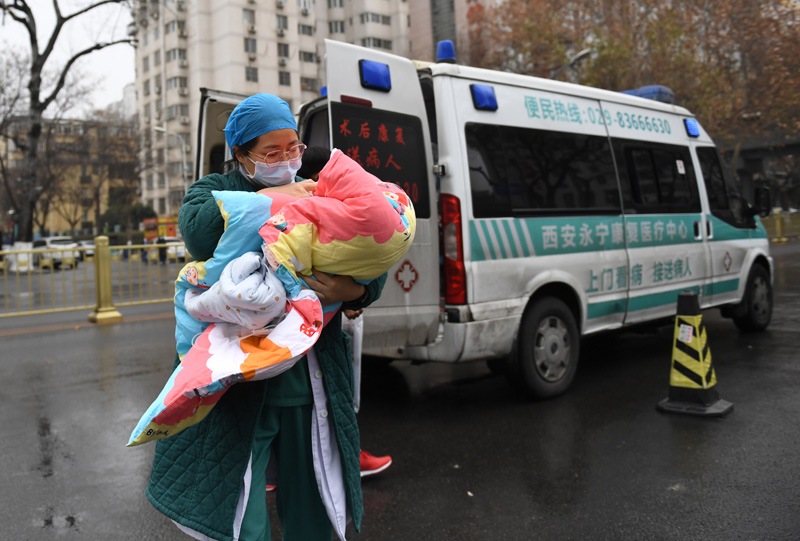 在西安交通大學第二附屬醫(yī)院,兒科醫(yī)生王莉接診一名被救護車轉運就醫(yī)的嬰兒(1月8日攝)。新華社記者 李一博 攝