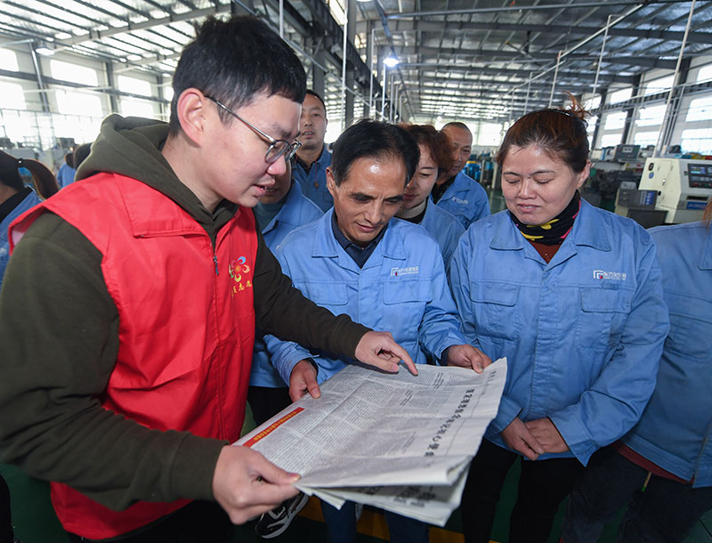 2021年11月24日,在浙江省杭州市臨安區(qū)一家公司車間,青年黨員志愿者在宣講黨的十九屆六中全會(huì)精神。新華社記者 徐昱 攝
