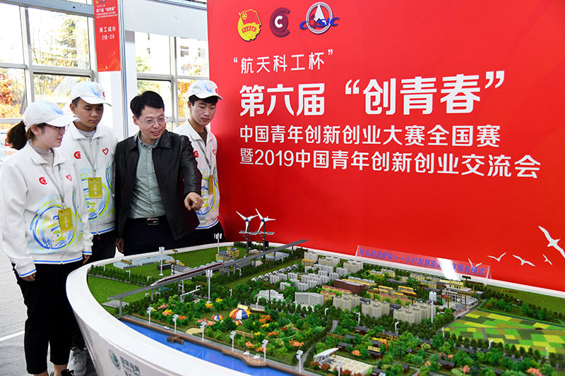 2019年11月1日,在山東青島舉行的第六屆“創(chuàng)青春”中國青年創(chuàng)新創(chuàng)業(yè)大賽全國賽暨2019中國青年創(chuàng)新創(chuàng)業(yè)交流會(huì)上,參會(huì)人員在給志愿者介紹新鄉(xiāng)村智慧能源服務(wù)模式。新華社記者 李紫恒 攝