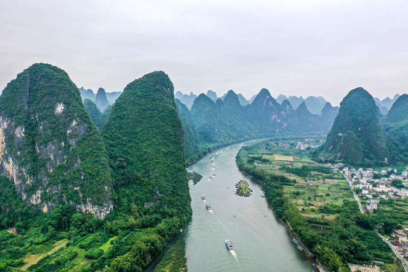 這是2021年4月25日拍攝的漓江廣西陽(yáng)朔段(無(wú)人機(jī)照片)。新華社記者 曹祎銘 攝