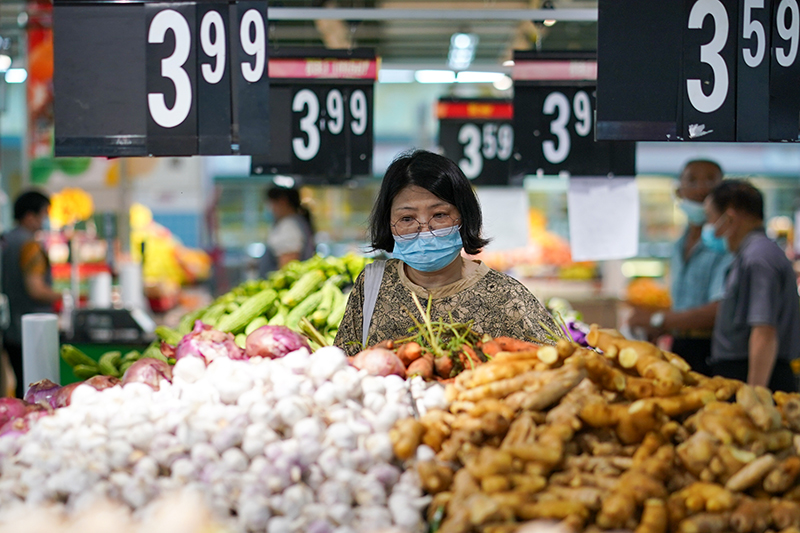 市民在江蘇省無錫市經(jīng)開區(qū)華潤萬家超市購物(2022年7月7日攝)。江蘇省無錫市在做好疫情防控的同時,積極制定相關方案,制作城市保供地圖,組織大型商超、市場正常運營,全力保供穩(wěn)價,端穩(wěn)市民“菜籃子”。新華社記者 李博 攝