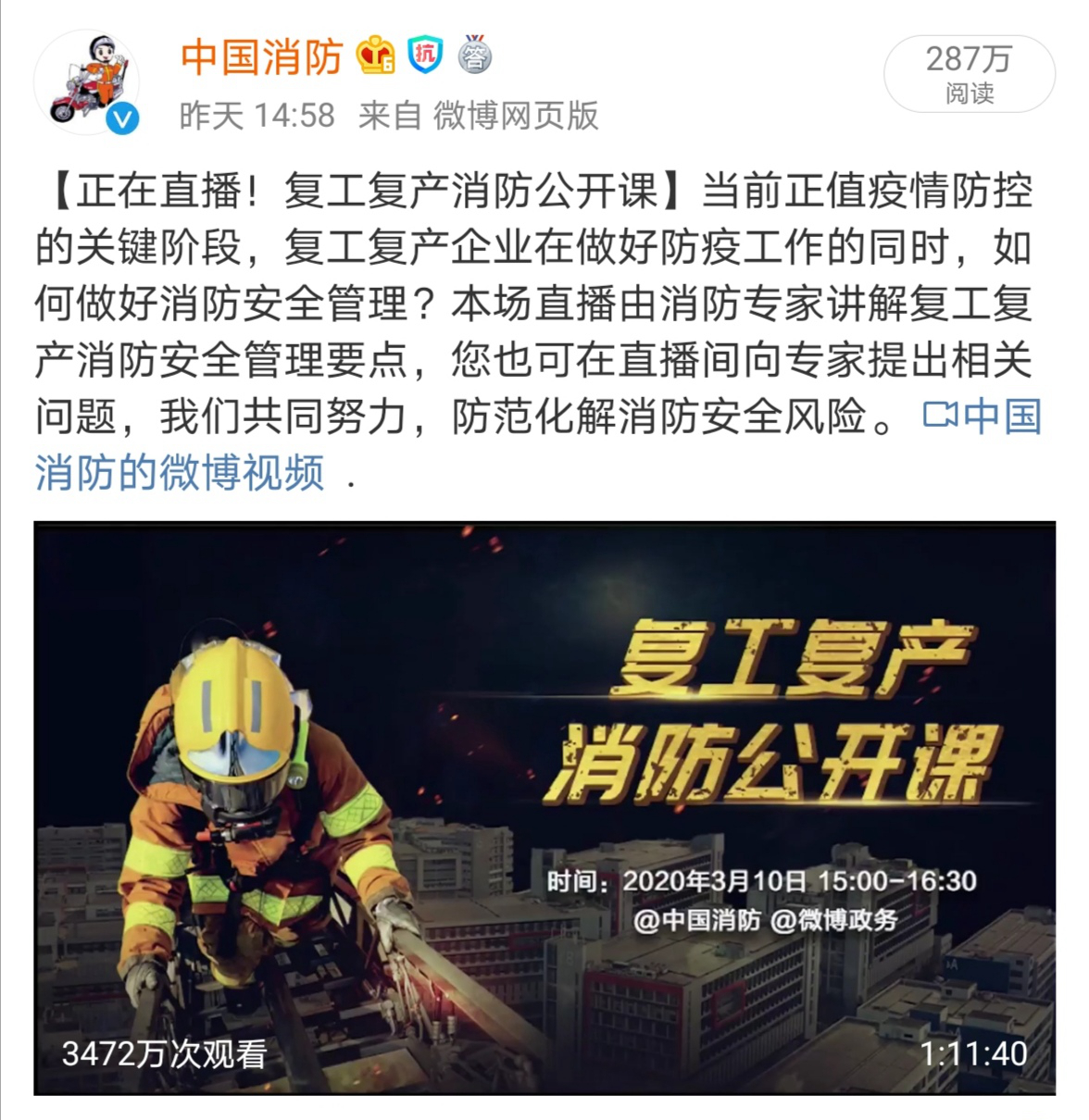 3月10日下午,消防救援局利用官方微博“@中國(guó)消防”組織開展了“復(fù)工復(fù)產(chǎn)消防安全網(wǎng)絡(luò)直播”,系統(tǒng)講解企業(yè)消防安全要點(diǎn)。截至11日16時(shí),已有3472萬企業(yè)員工在線觀看。