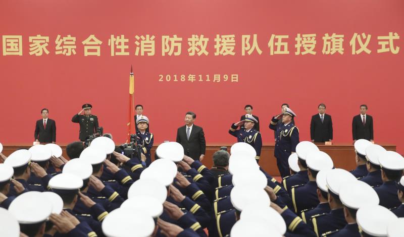 2018年11月9日,國家綜合性消防救援隊伍授旗儀式在人民大會堂舉行。習近平總書記向國家綜合性消防救援隊伍授旗并致訓詞。